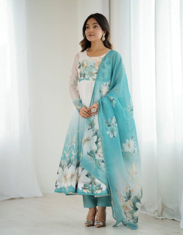 Prachi Aqua Blue & White Floral Print Anarkali Gown