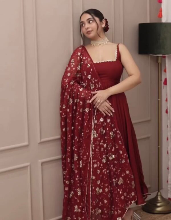 Model Height: 5.5 Model Is Wearing : M Size Gown :Fabric – Georgette Work – Embroidery Sequence Design WorkFlair : 4.50mtrHeight