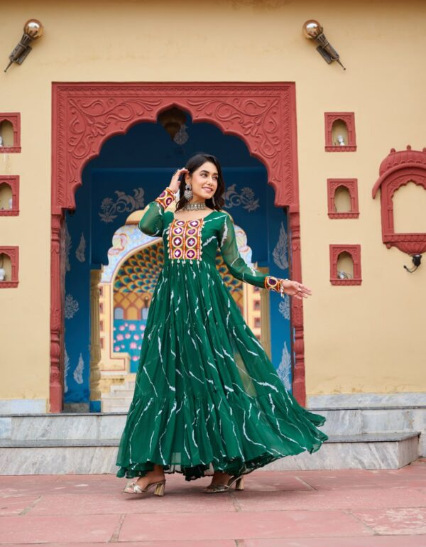 Product Detail : Gown:- Fabrics :- Laheriya PrintWork :- kutchi patchework in Faux GeorgetteLength :- 56 InchFlair :- 12 MeterLining(Inner) :-