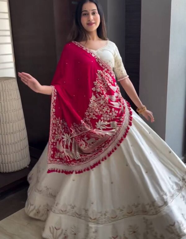 FABRIC DETAILS : Lehenga :- (Full-Stitched) :-Fabrics & Work :- Kora Cotton with Standard Frill stitchingClosure :- Chain Attached &