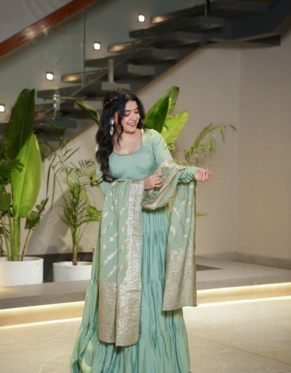 Model Height: 5.5 Model Is Wearing : M Size Gown :Fabric – Faux BloomingWork – Embroidery Zari Sequins-work, Fancy NeckFlair : 4.50mtrHeight – 56 INCHType