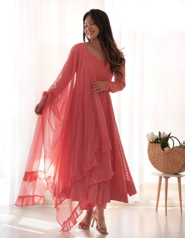 Model Height: 5.5 Model Is Wearing : M Size Anarkali :-Fabric: Heavy Pure Soft Fox GeorgetteWork :Lukhnowi Sequence WorkFlair : 4