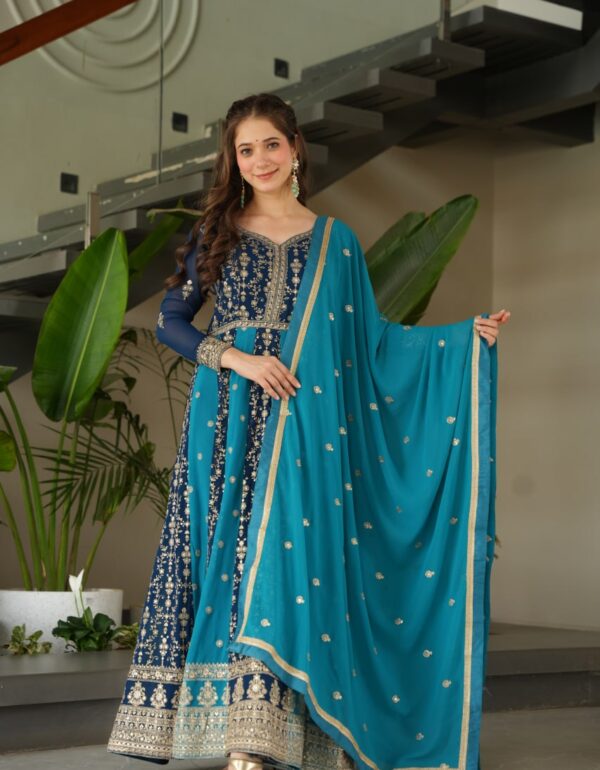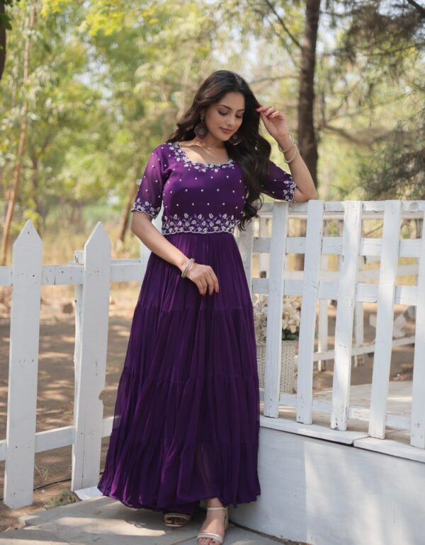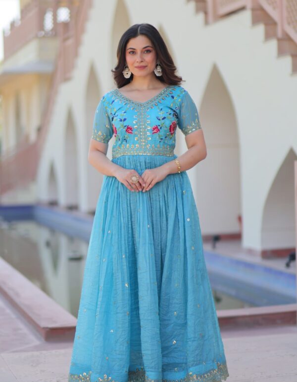 Model Height : 5.5 Model Is Wearing : M Size GOWN  :-  FABRICS & WORK :- Faux Blooming With Zari & Sequins Embroidered