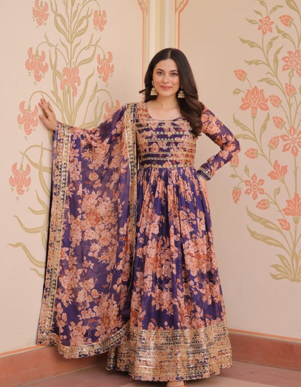 Model Height: 5.5 Model  Height– M Size GOWN :- FABRIC & WORK :-Russian Silk Rich Digital Print With Embroidered Sequins