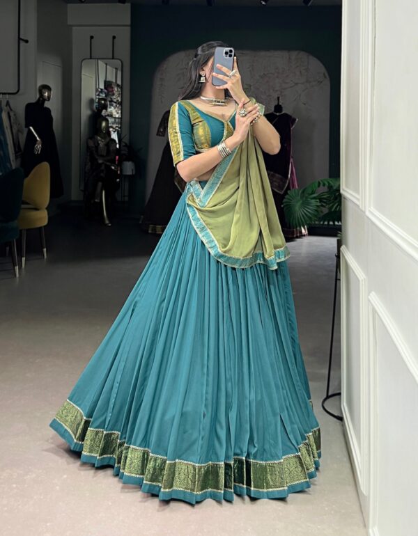 Royal Teal Woven Lehenga Set with Contrast Olive Dupatta
