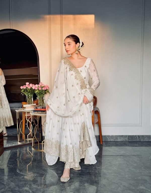 GOWN • Fabric: Pure Chinon Silk with Heavy Embroidery and 5mm Sequin Work • Sleeves: Full (24–25 inches) with attached pad • Inner: Heavy Micro Cotton • Length: 53–54 inches • Flair: 3 meters • Stitching: Fully stitched and ready to wear BOTTOM (Pant) • Fabric: Heavy Butter Silk with Embroidery Work and Elastic Waist • Length: 40–41 inches • Stitching: Fully stitched DUPATTA • Fabric: Pure Chinon Silk • Work: Embroidery with 5mm Sequin Work • Stitching: Fully finished