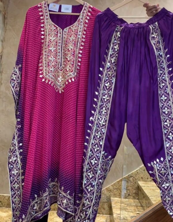 Fabric Details Kaftan Fabric: Premium Chinon Silk Work: Elegant embroidery paired with digital print detailing. Sky-colored hanging tassels adorn both sides, adding a unique touch. Inner: Comfortable micro cotton lining for added softness and ease. Length: 46-47 inches Dhoti Fabric: Soft Butter Silk for a smooth and luxurious feel Work: Enhanced with a fancy embroidered lace border, giving the dhoti a rich and graceful look. Length: 38-39 inches