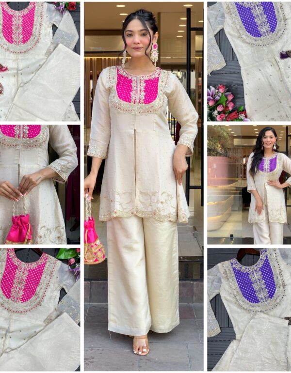 Top Details: • Fabric: Pure Heavy Chinnon Silk • Work: Heavy embroidery with sequence and real mirror handwork • Sleeves: Full-length • Inner: Heavy Micro Cotton • Length: 36–37 inches • Stitching: Fully stitched and ready to wear Sharara Details: • Fabric: Pure Heavy Chinnon Silk • Work: Embroidery with sequence and real mirror detailing • Length: 40–41 inches • Stitching: Fully stitched Dupatta Details: • Fabric: Pure Heavy Chinnon Silk • Work: Embroidery with sequence, real mirror handwork, and four-side lace border Weight: Approx. 1 kg