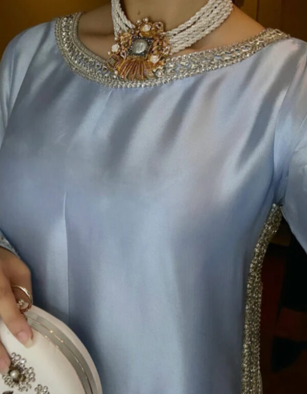 Kurta A vision in serenity, the kurta of the Icy Elegance Ensemble is crafted from luxe raw silk, featuring a straight silhouette that exudes understated sophistication. The neckline and panels are adorned with handcrafted delicate embellishments, lending a subtle sparkle. Inside, a soft butter silk lining ensures all-day comfort while enhancing the fall of the fabric. Designed to radiate effortless grace, this kurta captures timeless charm in every stitch. Pant Paired with sleek, straight-cut raw silk trousers, the ensemble maintains its minimal yet polished aesthetic. The trousers are tailored for a clean finish, perfectly balancing the kurta’s embellishments with refined simplicity. Shipping Info Your Icy Elegance Ensemble will be shipped within 3 to 8 business days. Each piece is carefully packed to preserve its intricate detailing and pristine condition. Care Dry clean only. Due to the delicate nature of the embellishments and fine fabrics, handle with care to maintain the garment’s original beauty. Note on Color Variation This ensemble is made using artisanal techniques. Slight variations in color and detailing are natural and reflect the individuality of each handcrafted piece.