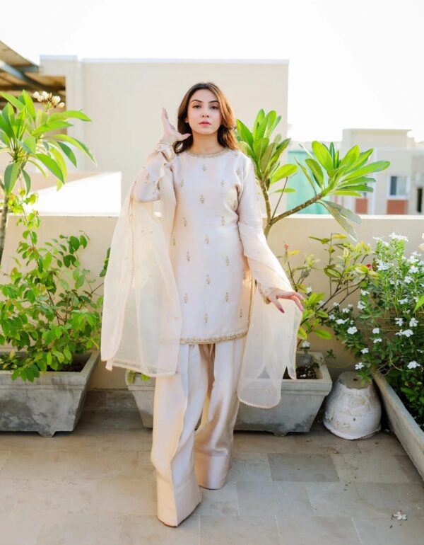 ' • Top Fabric: Pure natural crepe with 5 mm sequin embroidery and hand-finished diamond work on the sleeves • Top Inner: Micro cotton • Top Length: 35-36 inches • Palazzo Fabric: Pure natural crepe with 5 mm sequin embroidery and elastic waistband • Palazzo Style: Farshi palazzo • Palazzo Inner: Micro cotton • Palazzo Length: 40 inches • Dupatta Fabric: Soft nylon organza silk with 5 mm sequin embroidery and four-sided lace border • Dupatta Length: 2.20 meters Crafted with attention to detail and quality, this outfit is perfect for festive occasions, weddings, and celebrations. Style Statement: A unique design for your unique style.