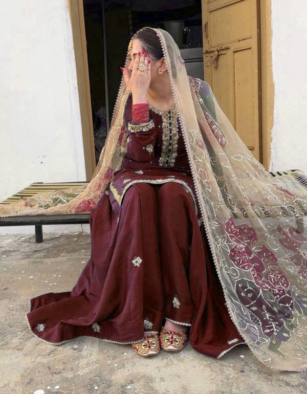 - Style: Long kameez with dupatta
