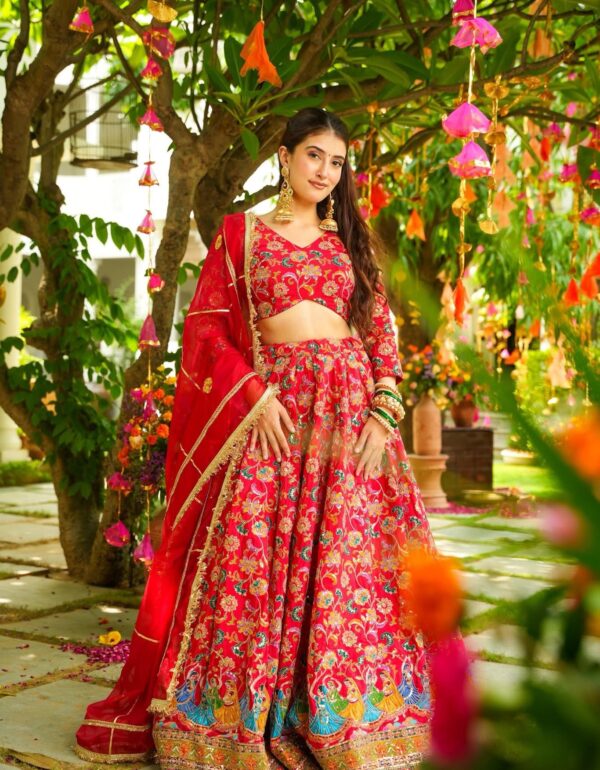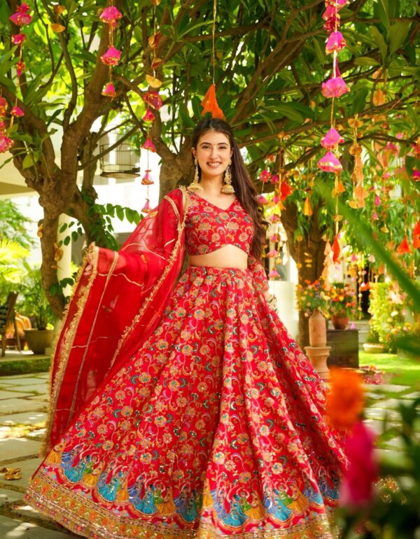 * Dupatta: Completing the ensemble is a 2.30-meter dupatta made from Fox Georgette with heavy embroidery, thread, and sequence work to match the lehenga and choli.