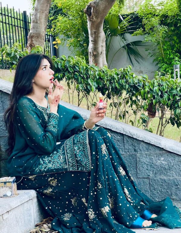 - Hand-embroidered detailing in gold zari and sequins, accented with aqua-blue stones
