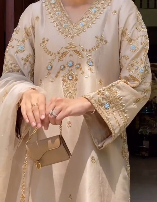 - Intricate embellishments on neckline, hem, and sleeves for a luxurious finish