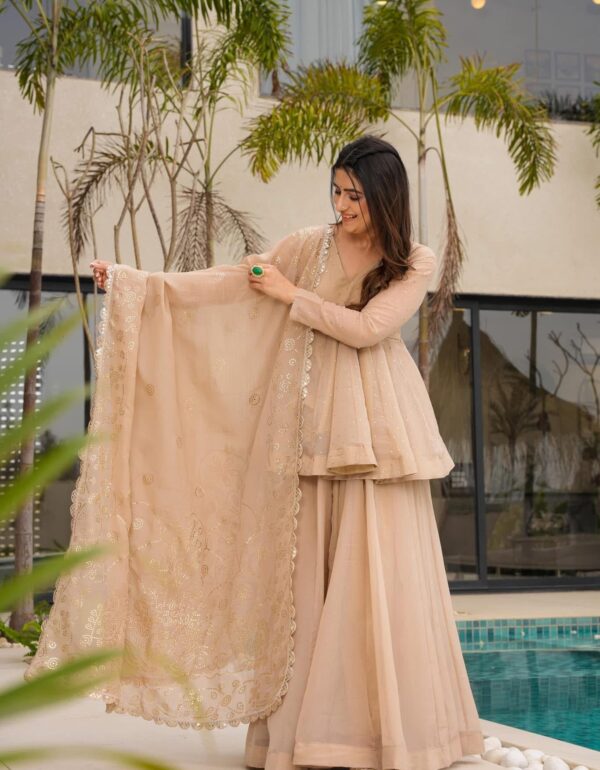 Top Fabric: Heavy Chinon Silk with digital print, organza embroidery, 5 mm sequin patch work, and fancy sleeves