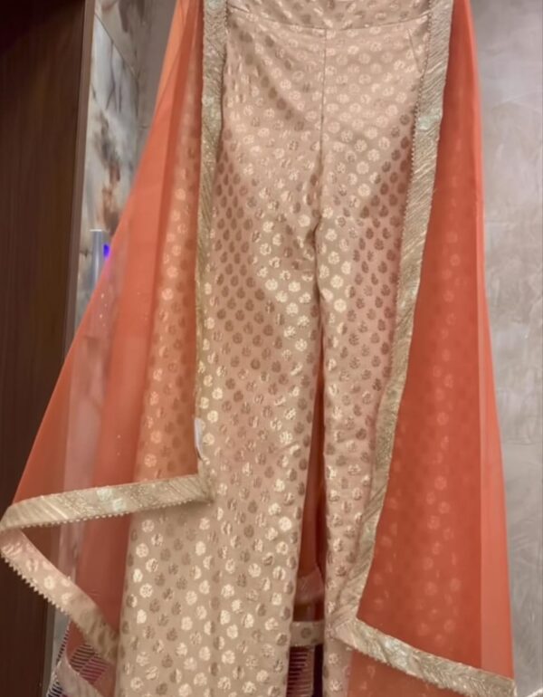 “Capture the magic of the ‘Golden Hour’ with this stunning brocade palazzo suit. Crafted from a radiant golden fabric with