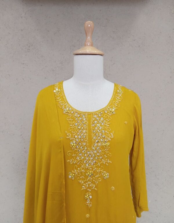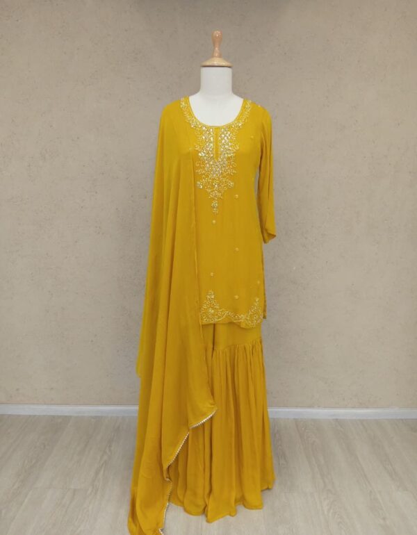 Make a statement with this elegant Golden Radiance Sequin Sharara Set, featuring a vibrant yellow hue and exquisite hand-embroidered details. The kurta showcases intricate sequin, bead, and pearl embellishments around the neckline, lending a rich festive touch. Crafted in a lightweight, flowy fabric, the set includes a matching sharara and a coordinating dupatta with delicate edging for a graceful silhouette.