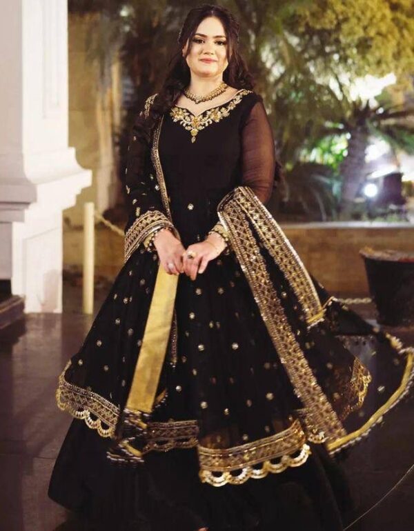 • Fabric: Heavy Chinon Silk with Multi-Thread Embroidery, Sequin Work, and Flare