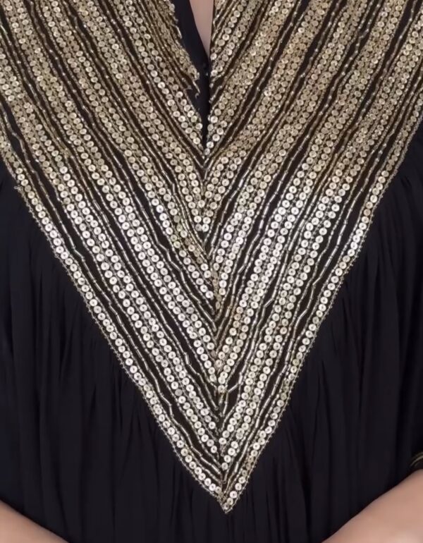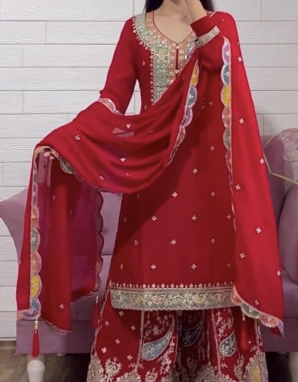 • Fabric: Heavy Chinon Silk with Multi-Thread Embroidery and Sequin Work (includes sleeves)