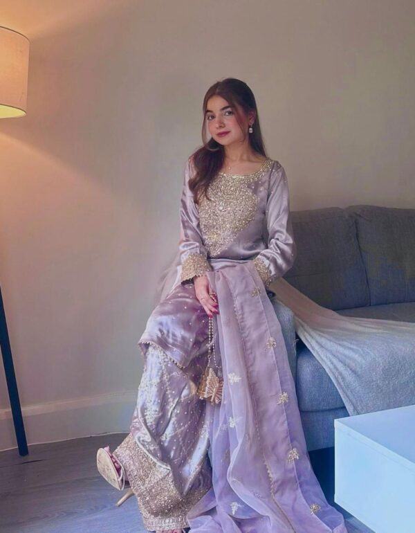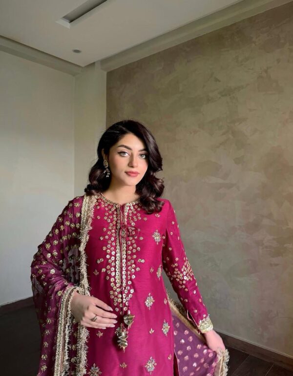 • Work: Zari, thread, and 5mm sequins embroidery with fancy resa lace border