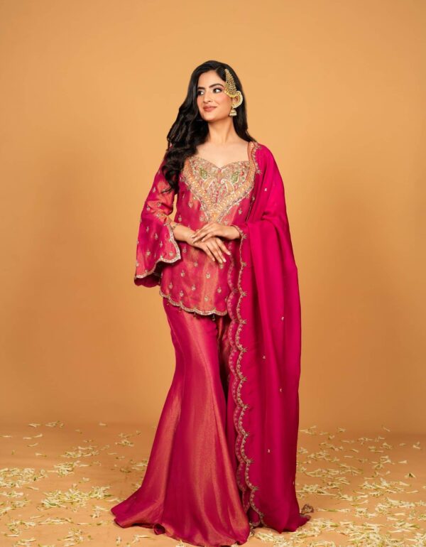 Make a statement in this stunning magenta top crafted from luxurious Nazakat fabric, designed to radiate festive elegance. It features intricate Zardosi, sequin, pearl, and dori work, blending traditional craftsmanship with contemporary flair.