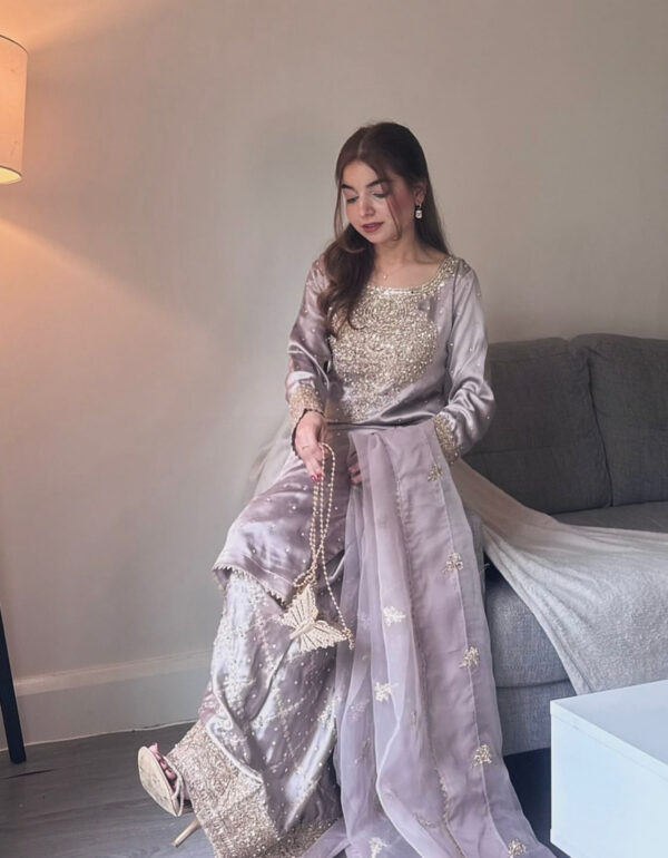 Long straight kurta crafted in premium sheesha silk, adorned with delicate hand embellishments and a finely detailed neckline. The soft sheen of the fabric adds a touch of luxury, making it perfect for festive or formal occasions.