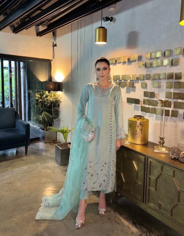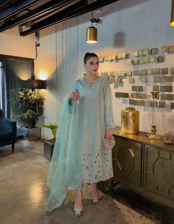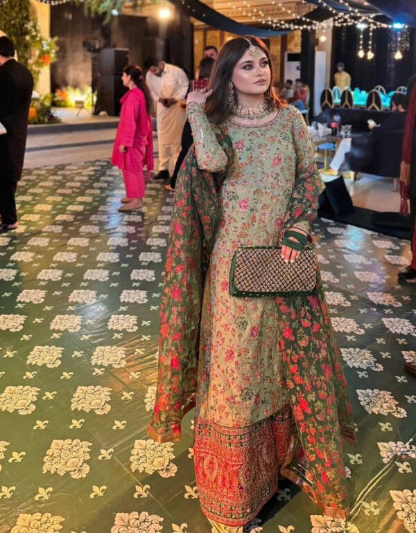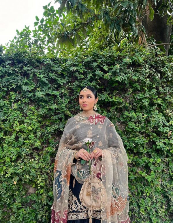 • Dupatta: Luxurious 2.2-meter Pure Silk Organza with digital print, heavy sequin work, and hand-painted detailing.