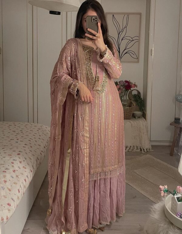 Regal Peach Luxe Georgette Suit With Sequin Detail