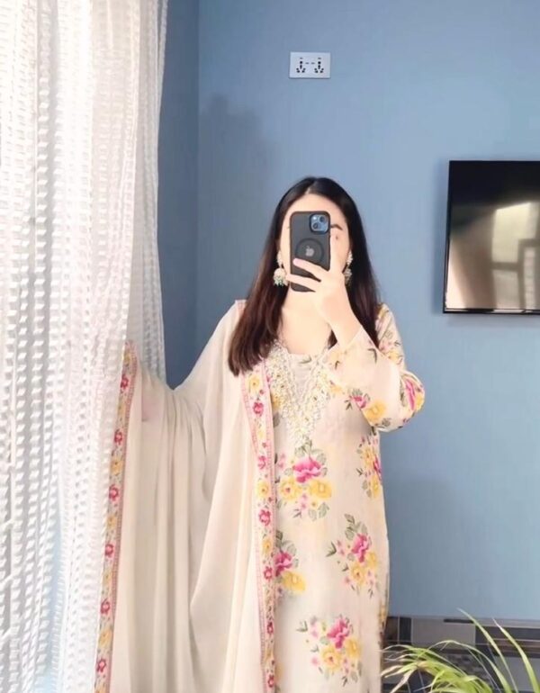 - Dupatta Work: Digital print with embroidered Chine sequins border