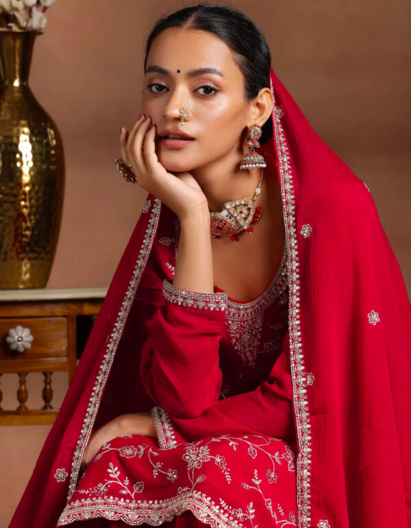 Regal Scarlet Luxe Ensemble With Palazzo & Dupatta