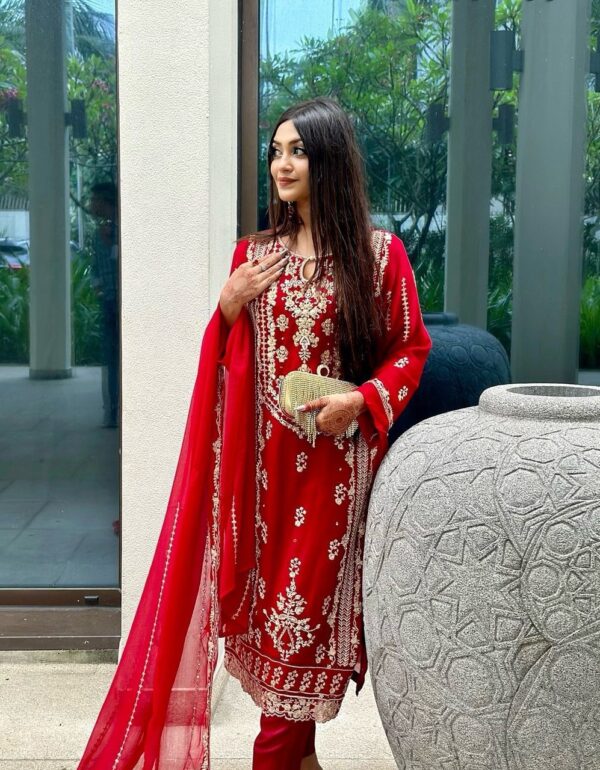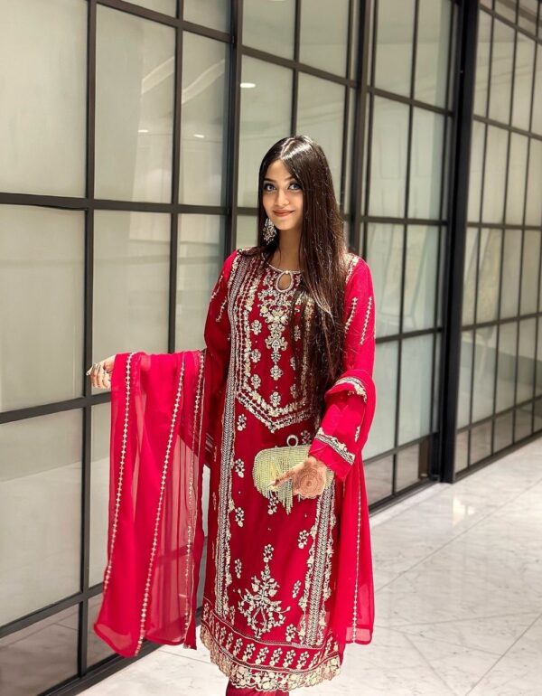 • Dupatta: Soft butterfly net with intricate embroidery, four-side fancy latkan lace border