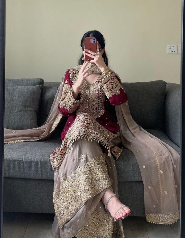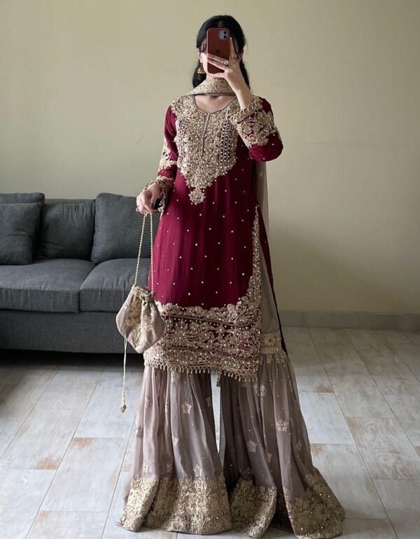 Perfect for the upcoming festive season, providing a traditional yet stylish look.Regal Wine Georgette Sharara Set With Luxe Embroidered Dupatta