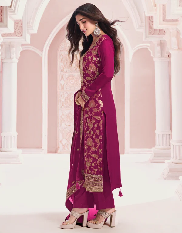 - Exquisite Magenta Hue: The vibrant magenta color adorned with intricate golden motifs adds a royal and festive charm to your wardrobe.