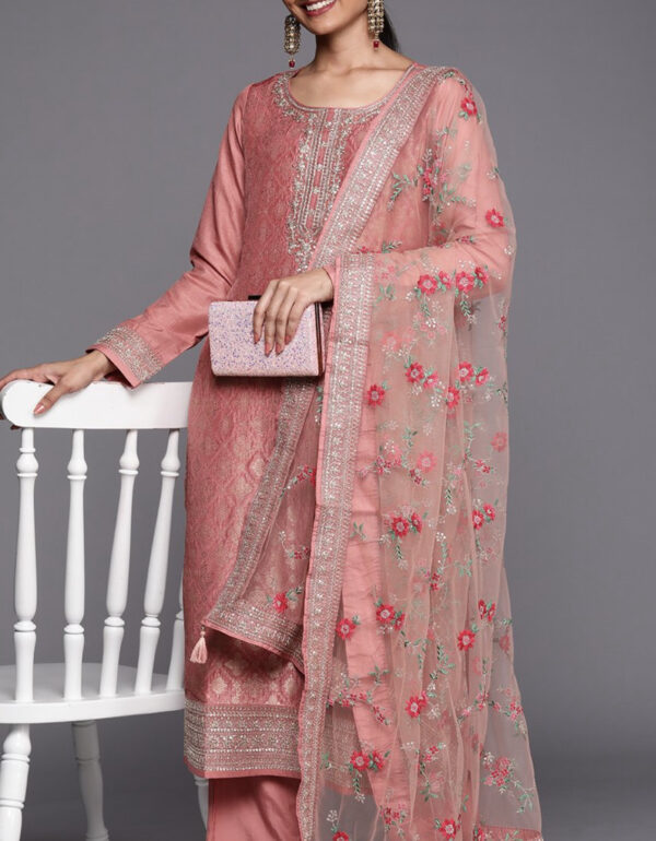 • Kurta Fabric: Pure Chinon silk with beautiful embroidery, sequin, and zari work on the yoke, sleeves, and bottom.