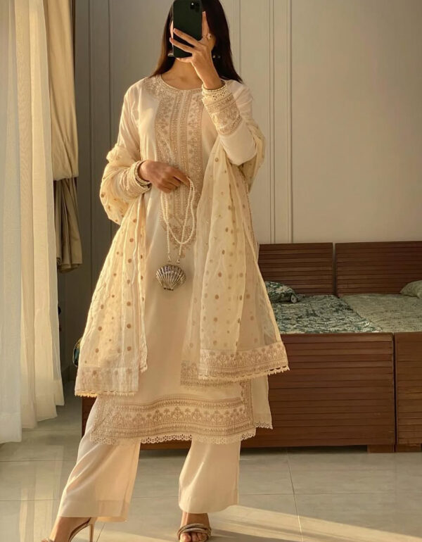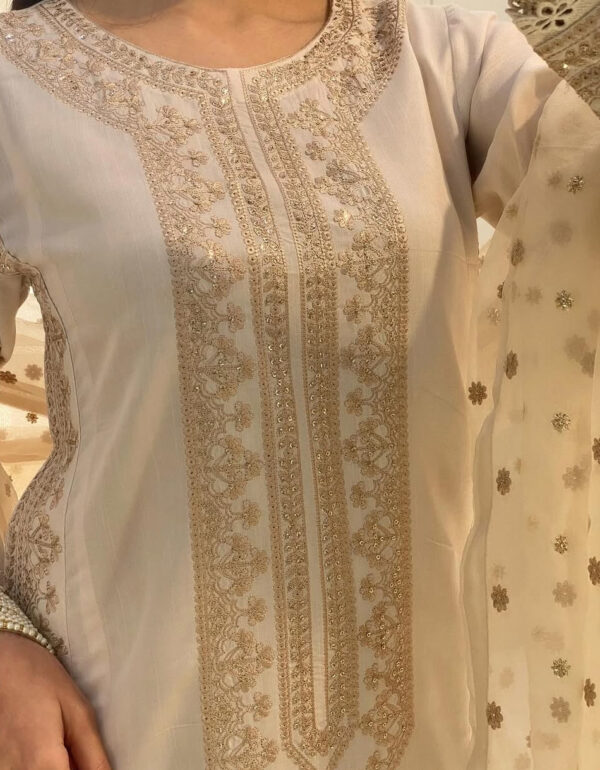 Step into timeless elegance with our Zarqa Ivory Ensemble, a majestic three-piece suit tailored from the finest butter silk fabric that drapes like a dream. The kurta features intricate hand embellishments with shimmering mirror and sequin work, creating a luminous neckline and border detailing that exudes pure sophistication.