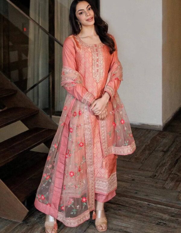 The dupatta, a sheer vision of beauty, is detailed with delicate gold motifs and finished with finely embroidered borders, adding a layer of soft sophistication. Paired with a tailored raw silk trouser, the silhouette flows effortlessly, offering structure without compromising comfort.