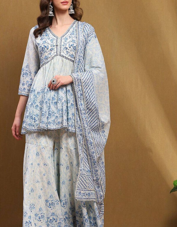 • Kurta: A-line shape, round neck, floral printed, sequinned accents, above-knee length