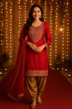 This festive-ready suit set combines traditional embroidery with a luxurious silk-blend fabric, perfect for weddings, parties, and festive occasions. Styled with a Patiala salwar, straight-cut kurta, and matching dupatta, this piece exudes timeless charm.