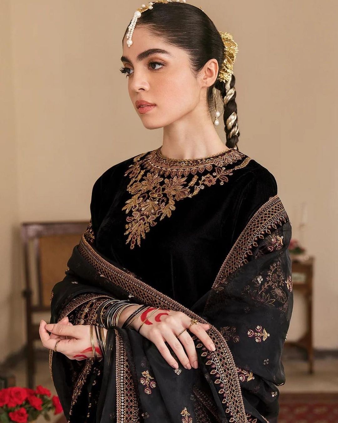 Yaar, suit bohot hi sundar hai! Velvet ka fabric aur sequins ka kaam dono hi classy lagte hain. Shaadi ke liye perfect choice hai.