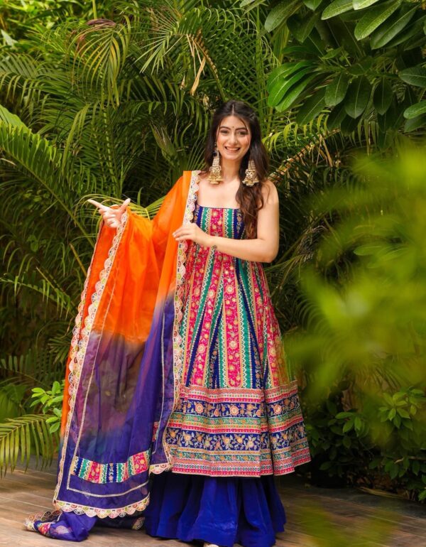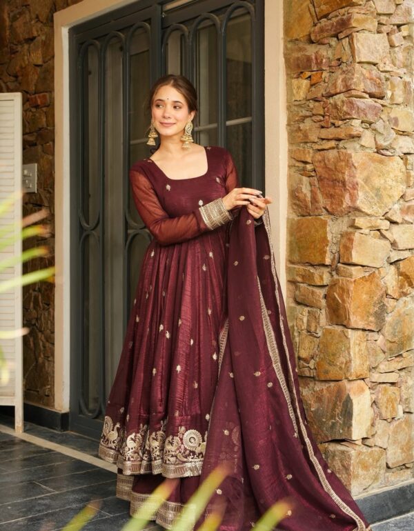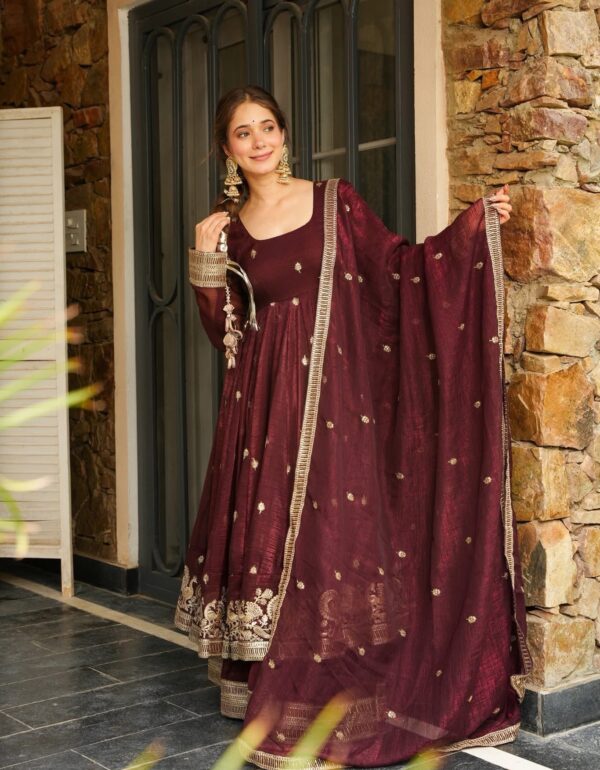 - Gown: Heavy georgette with sequins, zari & thread embroidery work and 3-meter flair