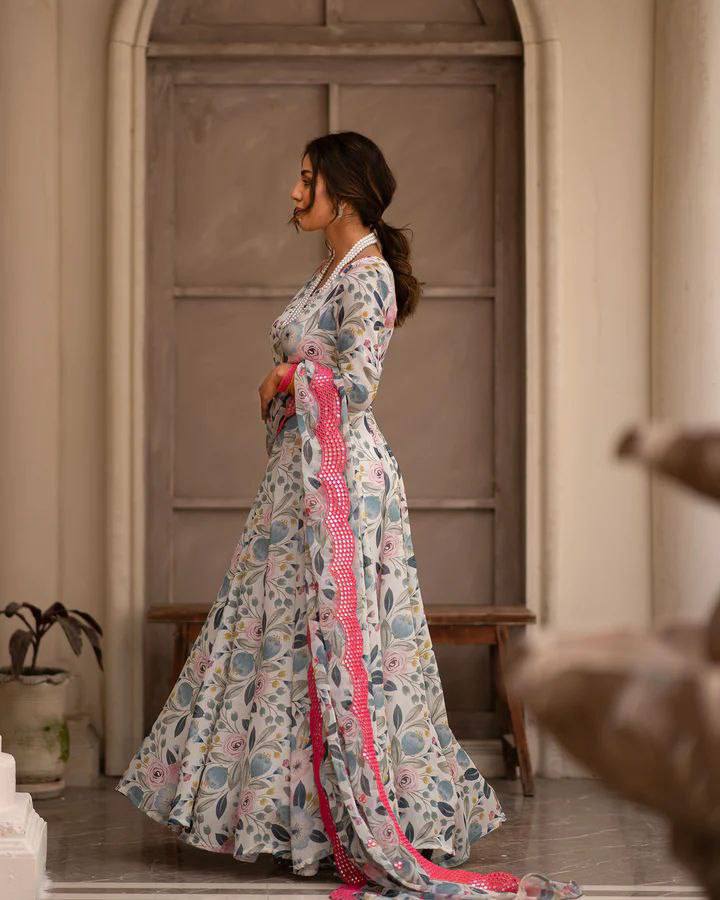 The Blossom Elegance Anarkali is a stunning blend of traditional charm and modern grace. Adorned with delicate floral prints, this Anarkali is crafted from soft, flowing fabric that drapes beautifully, offering both comfort and style. The pastel hues and intricate detailing of the dupatta add a touch of sophistication, making it perfect for festive gatherings, weddings, or any special occasion. Whether it’s the vibrant colors or the timeless silhouette, this dress is designed to make you feel elegant and radiant.
