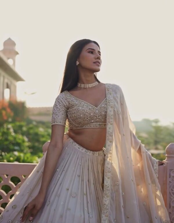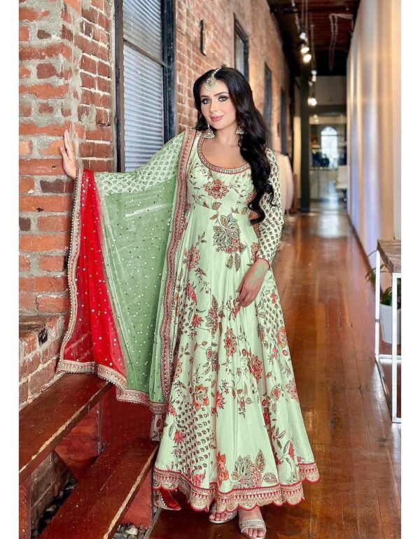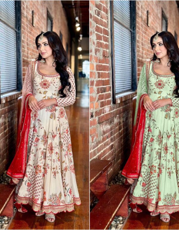 Absolutely stunning outfit! The Chinon silk feels so luxurious and the embroidery is intricate. Perfect for festive occasions.