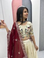 The lehenga is absolutely stunning! The cream and maroon combo is so elegant and perfect for weddings.