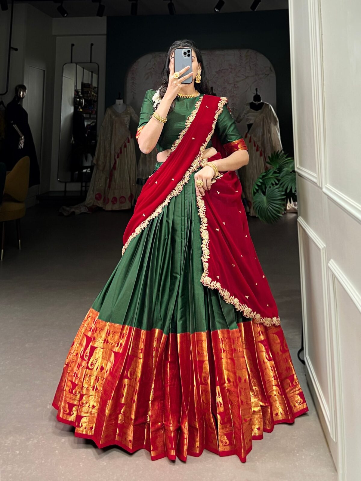 Yaar, yeh lehenga bohot hi sundar hai! South Indian vibe kaafi classy lag raha hai. Totally worth it.
