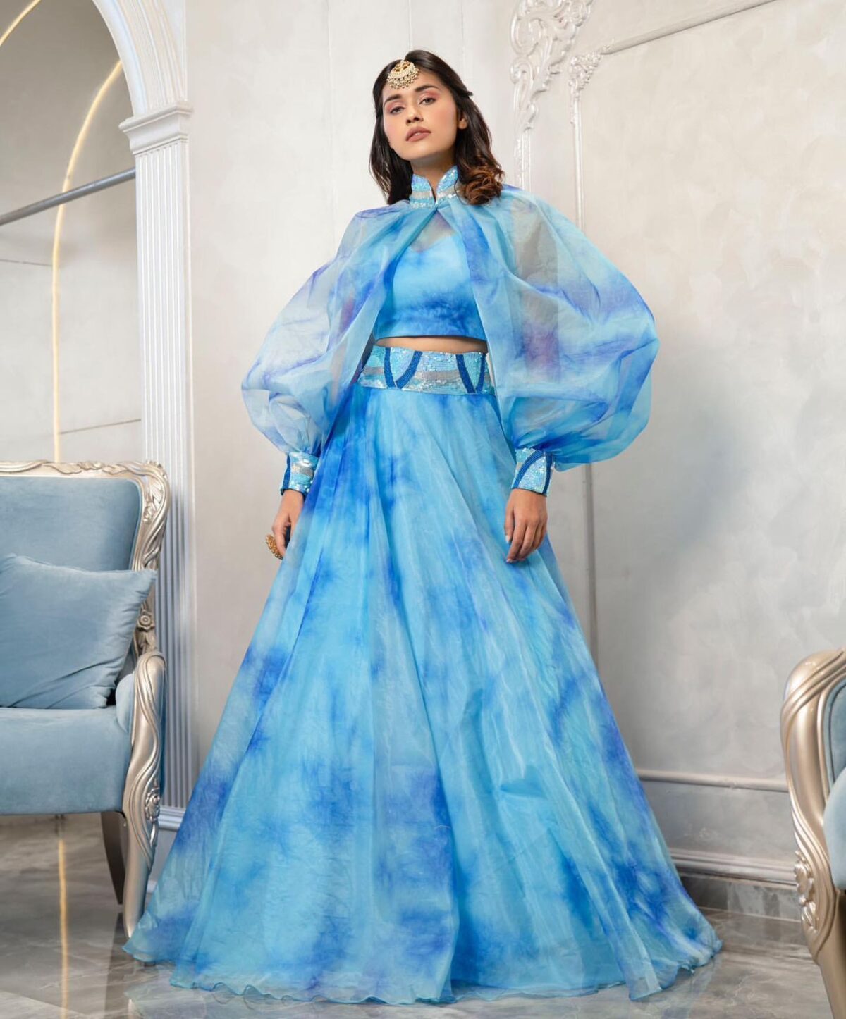 The Launching Party Wear Digital Print Organza Lehengas with Fancy Struck Sleeves is a gorgeous and stylish outfit that is perfect for any special occasion or celebration. The lehenga is made from high-quality organza fabric, which is lightweight and flowy, giving it an elegant look and feel.