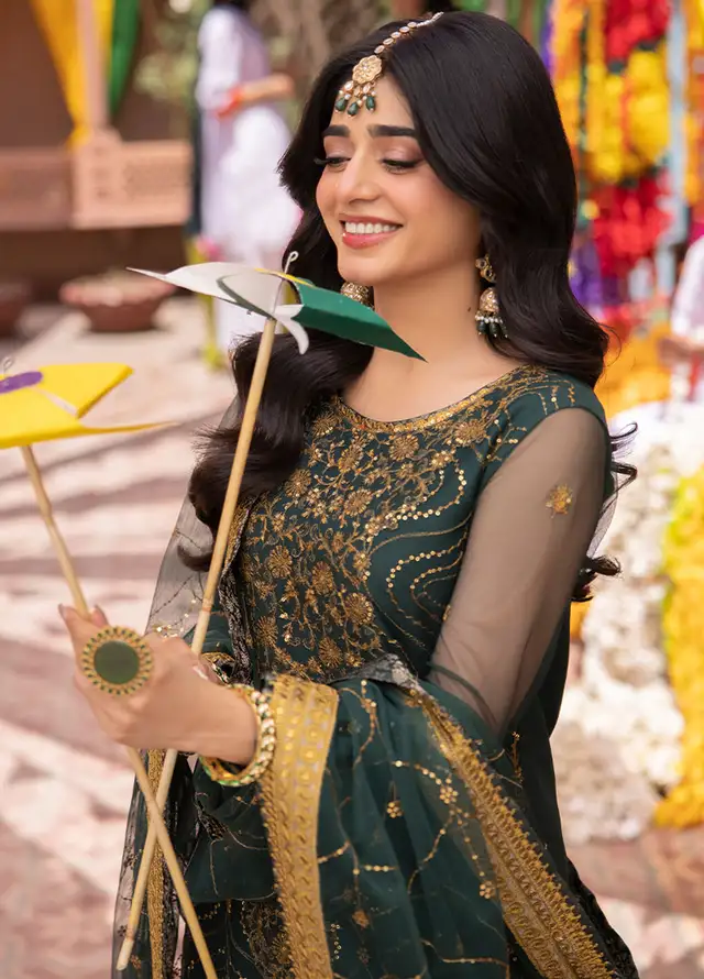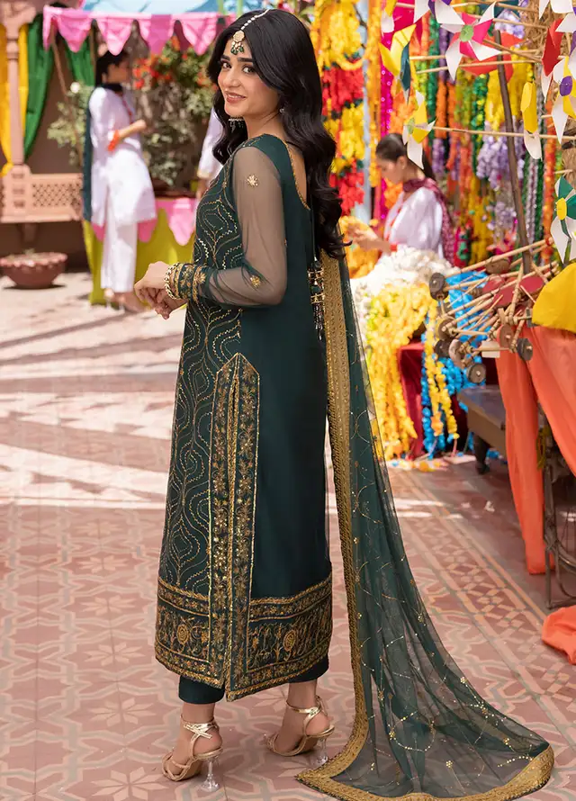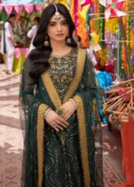 Step into the world of timeless elegance with our exquisite emerald green Anarkali suit. Adorned with intricate golden embroidery and paired with a flowy, sheer dupatta, this ensemble is perfect for festive occasions. The rich fabric and delicate detailing create a look that is both regal and enchanting. Make a statement and embrace the charm of traditional fashion with this stunning outfit.