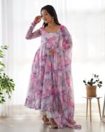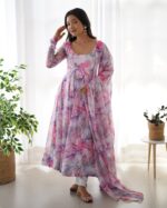Home Ethnic Wear Flux Organza Silk Floral Printed Anarkali Kurti Set