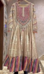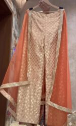 “Capture the magic of the ‘Golden Hour’ with this stunning brocade palazzo suit. Crafted from a radiant golden fabric with an enchanting dot pattern, this outfit offers both comfort and undeniable style. The wide-leg palazzo pants provide a modern silhouette, while the sheer, flowing dupatta adds a touch of ethereal charm. Perfect for celebratory gatherings, evening events, or making a chic statement, this set is designed for the woman who values elegance and contemporary design.”