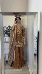 The Golden Mocha Embroidered Palazzo Suit is a sophisticated ensemble that combines traditional charm with modern elegance. Featuring a rich mocha hue, this outfit is adorned with intricate golden embroidery throughout the top and dupatta, adding a luxurious touch. The flared palazzo pants with subtle gold accents enhance its regal appeal, making it a perfect choice for weddings, festive occasions, or evening events. This suit offers a graceful silhouette that is both stylish and comfortable.