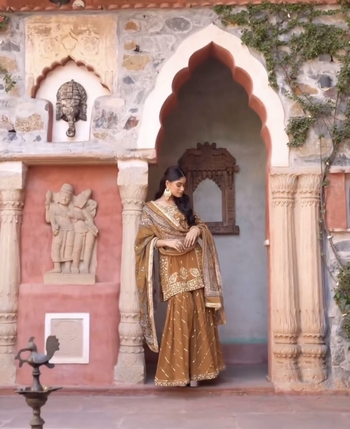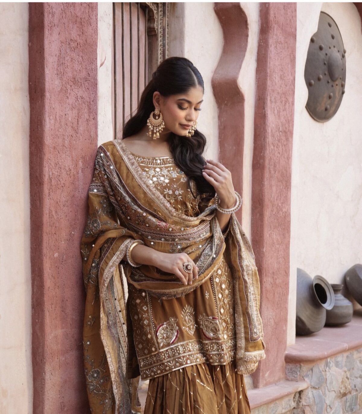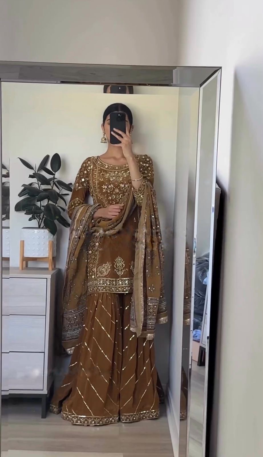 The Golden Mocha Embroidered Palazzo Suit is a sophisticated ensemble that combines traditional charm with modern elegance. Featuring a rich mocha hue, this outfit is adorned with intricate golden embroidery throughout the top and dupatta, adding a luxurious touch. The flared palazzo pants with subtle gold accents enhance its regal appeal, making it a perfect choice for weddings, festive occasions, or evening events. This suit offers a graceful silhouette that is both stylish and comfortable.